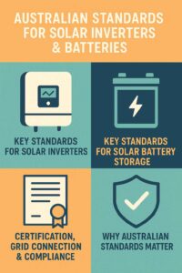 The main standard for grid-connected inverters is AS/NZS 4777.2:2020 – Grid Connection of Energy Systems via Inverters. This sets minimum performance & safety requirements for inverters connected to electricity distribution networks. It covers anti-islanding protection (automatic shutdown if the grid fails), voltage & frequency response, power factor, & quality of electricity supplied back to the grid.